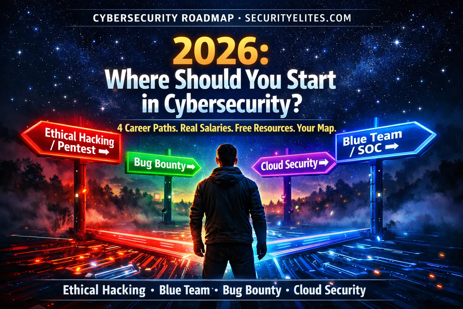 Choose a path. Build the universal foundation (networking, Linux, web basics, security concepts). Start with TryHackMe Pre-Security. Then follow your chosen path’s resource stack. The SecurityElites.com 100-Day Ethical Hacking Course is the most comprehensive free starting resource for the offensive security path.