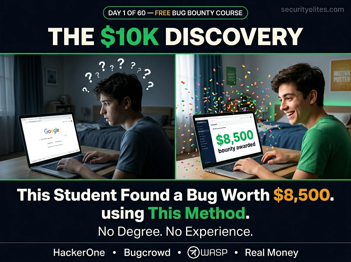 I started bug bounty with no degree, no security job, and no idea what I was doing. My first ever bounty was $75 for a simple information disclosure bug that took me three weeks to find and twenty minutes to understand. That $75 didn’t change my life financially — but it changed what I believed was possible. I built this 60-day course so your path from Day 1 to first bounty is a quarter of the time mine was. See you tomorrow for Day 2.