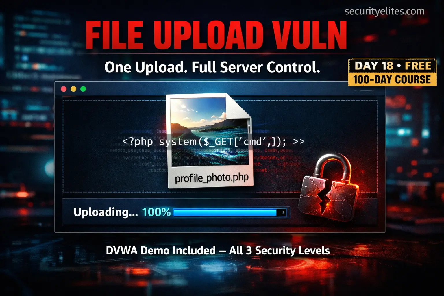 Day 19 covers Command Injection — a vulnerability category directly related to what we did today. Where file upload achieves RCE by uploading and executing code, command injection achieves it by injecting OS commands directly into application functionality. Same destination, different path — and equally dangerous when undefended.