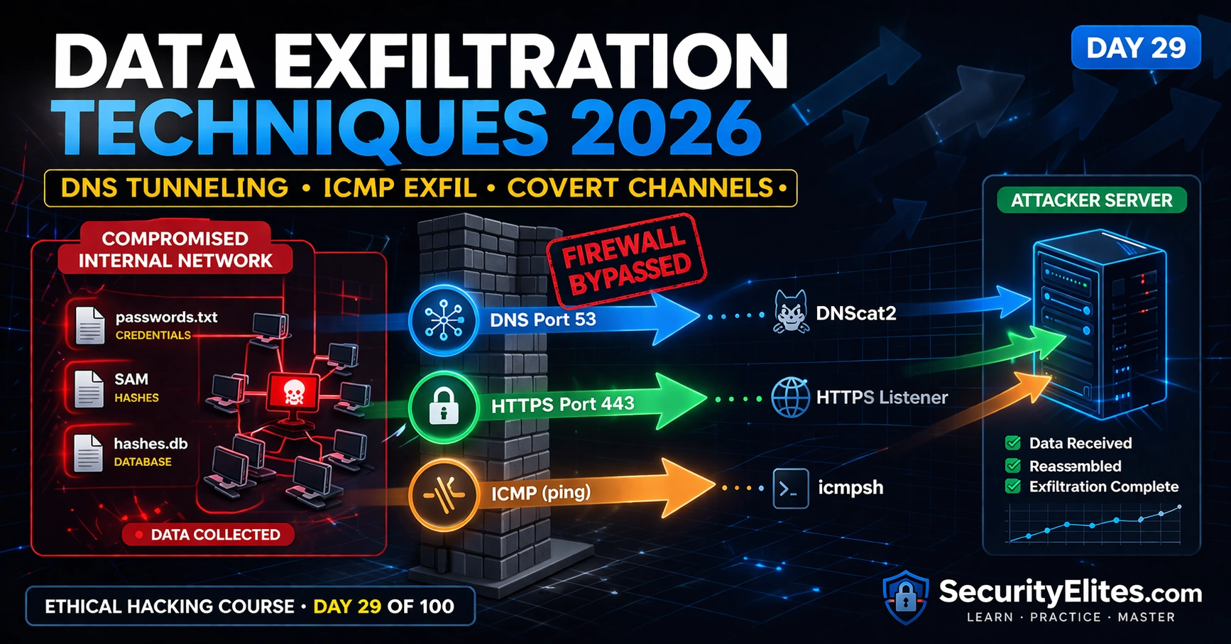Data exfiltration techniques 2026 — you have lateral movement covered from Day 28, credentials dumped, Domain Admin achieved. The engagement objective is not just “get Domain Admin.” It is “demonstrate that a real attacker could steal your sensitive data.” That requires exfiltration — actually moving collected data out of the network through channels that bypass egress filtering, DLP solutions, and firewall outbound rules. Today covers the three protocols that real red teams use because they are almost universally permitted outbound: DNS on port 53, ICMP echo, and HTTPS on 443. The firewall lets all three through. Your data leaves through all three.