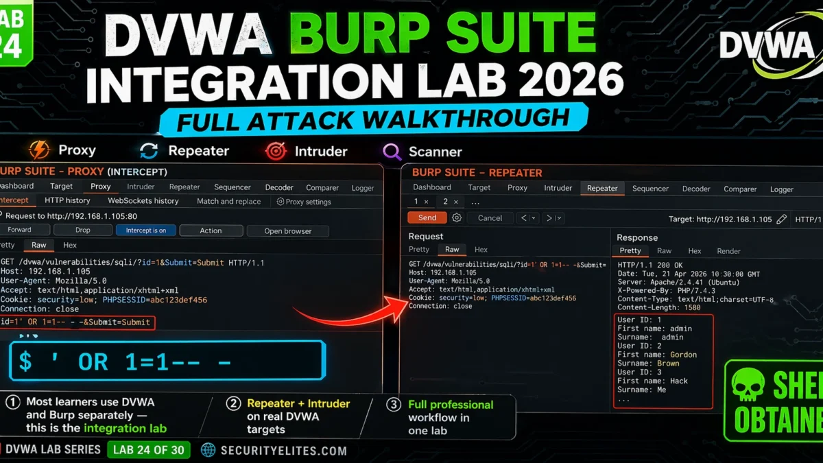 DVWA Burp Suite Integration Lab 24 integrates everything: proxy configuration, request interception, Repeater-based SQL injection, Intruder-based brute force, and Scanner on the full DVWA attack surface. By the end of this lab you’ll run every DVWA module through Burp the way a professional web application tester does.