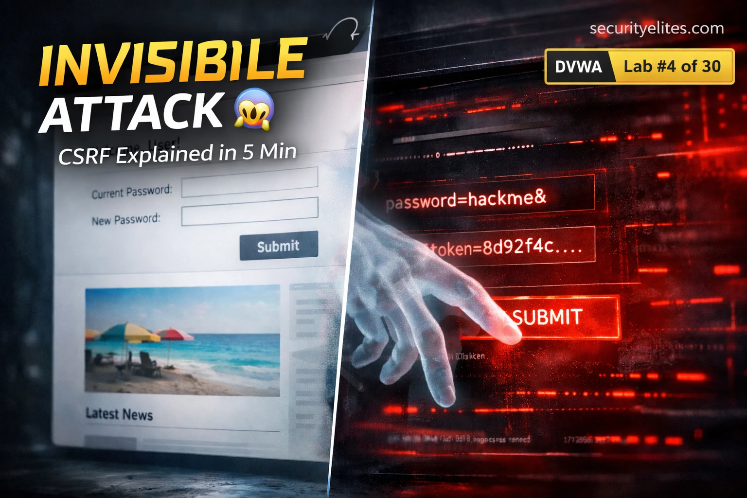 CSRF is the attack that turns a logged-in user’s own browser into a weapon against them — changing passwords, transferring funds, deleting accounts — without them clicking anything unusual or noticing anything wrong. The browser fires the forged request automatically. DVWA CSRF Lab walks you through all four security levels, from completely unprotected to the correct token-based implementation that defeats it entirely.