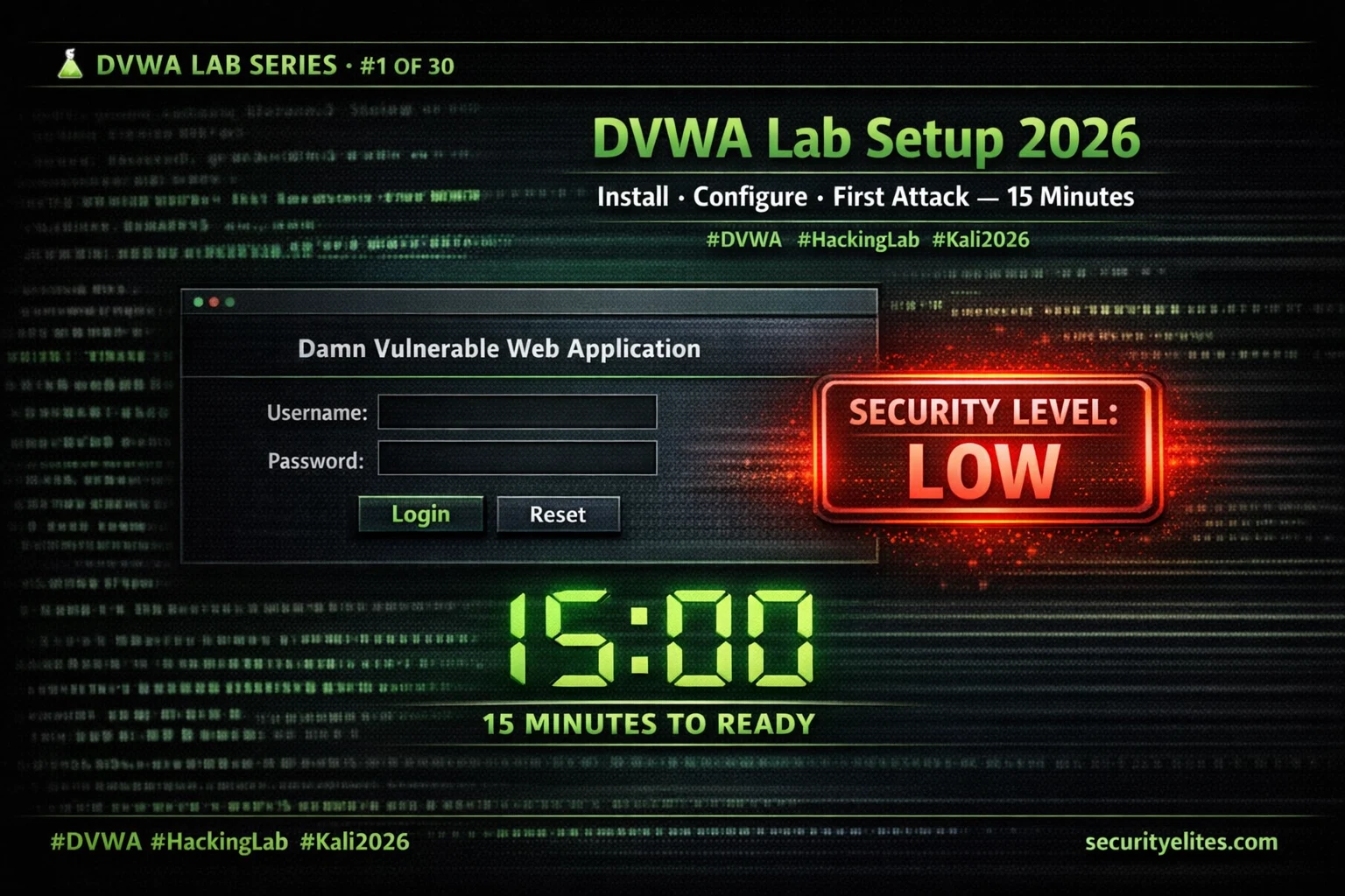 ⚠️ Isolated Lab Only: DVWA is intentionally vulnerable. Run it exclusively on localhost, a VM with a host-only network, or an isolated offline machine. Never expose DVWA to the internet or a shared network — its vulnerabilities are real and exploitable by others. All exercises in this 30-lab series target your local instance only. Lets start with DVWA Lab Setup 2026 tutorial.