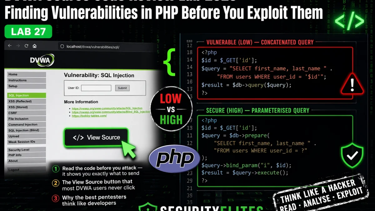 On a white-box web application assessment last year, the client gave me access to the PHP source code alongside the running application. The codebase had 40,000 lines. I found three critical SQL injection points in eleven minutes — not by running SQLMap, but by searching the source for the pattern $_GET and $_POST variables being concatenated into query strings. The source told me exactly which parameters to target, what the query structure was, and what payload would extract the data. DVWA’s View Source button teaches exactly that skill — reading what the application actually does with your input before you decide what to send it. Lets start with our DVWA Source Code Review Lab.