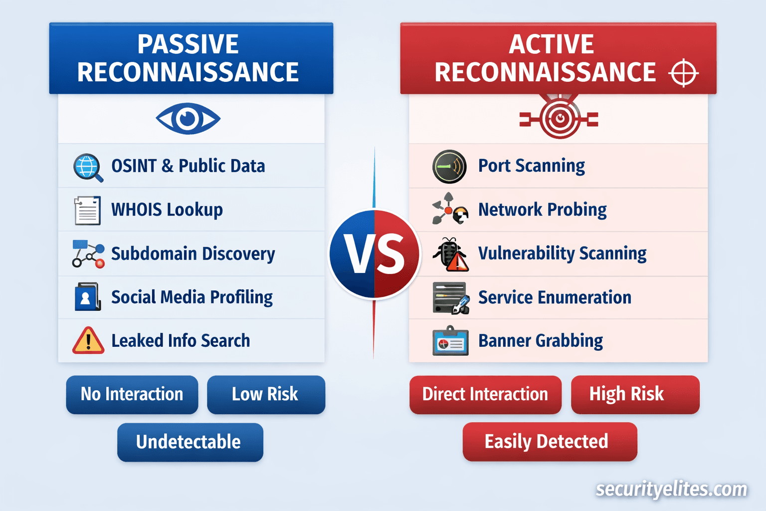 It begins with reconnaissance — specifically understanding the difference between Passive vs Active Reconnaissance.